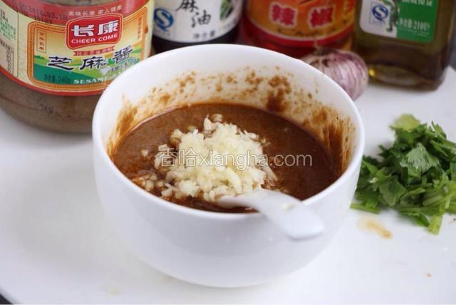 3.准备好调料:芝麻酱3汤匙用3汤匙水兑开,加香油2汤匙、生抽3汤匙、醋1汤匙、糖1汤匙、鸡精1茶匙、花椒油1茶匙、红油2汤匙、剁成蓉的蒜3瓣、香菜末适量。