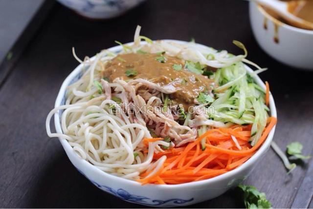 2.鸡腿晾凉,将鸡腿肉拆下撕成细丝。黄瓜、胡萝卜洗净切成丝,豆芽洗净备用,新鲜切面准备好。