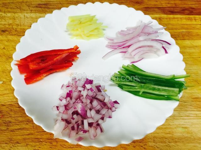 3.龙利鱼切成大段,青椒,红椒,洋葱姜准备好
