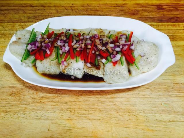 6.将姜洋葱丝铺在盘中,把腌制好的鱼段放在上面