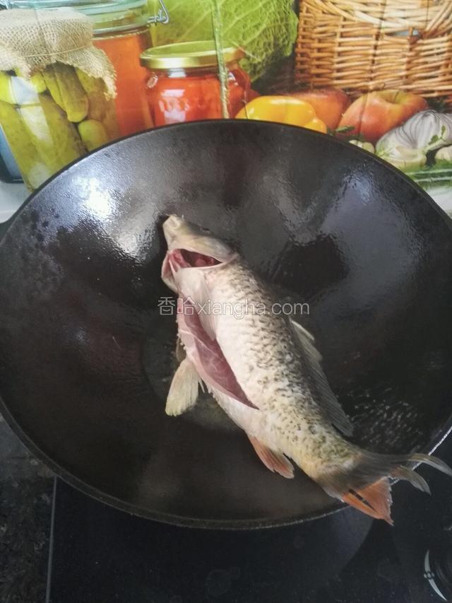 3.油锅加热,煎鱼,先入头后整个鱼身放入锅内,鱼放入锅内不要动,两三分钟后等鱼皮定型再翻身煎另一面