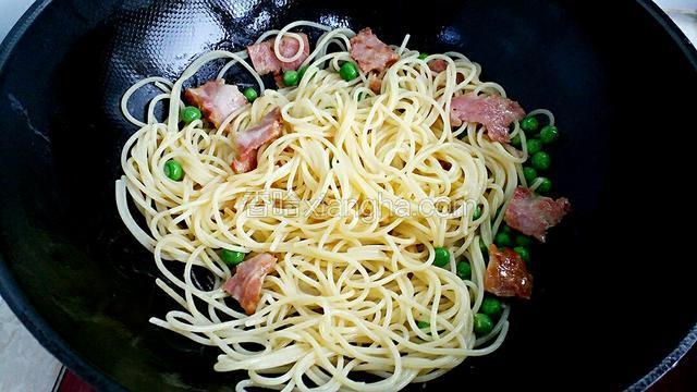 2.利用煮意面的时间准备辅料,圣女果洗净切两半,培根切小片,豌豆放入开水中焯一分钟捞出过凉水备用。