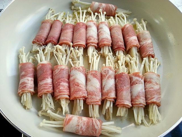 5.取适量金针菇,放在切好的培根底部