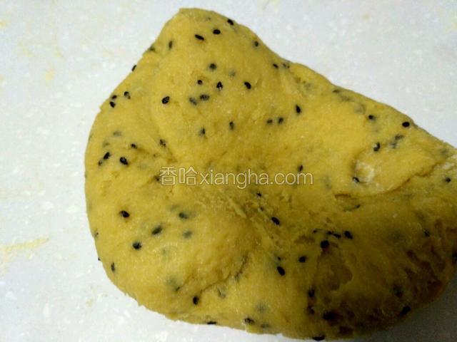 3.倒入面粉和玉米粉和芝麻,用刮刀拌匀。