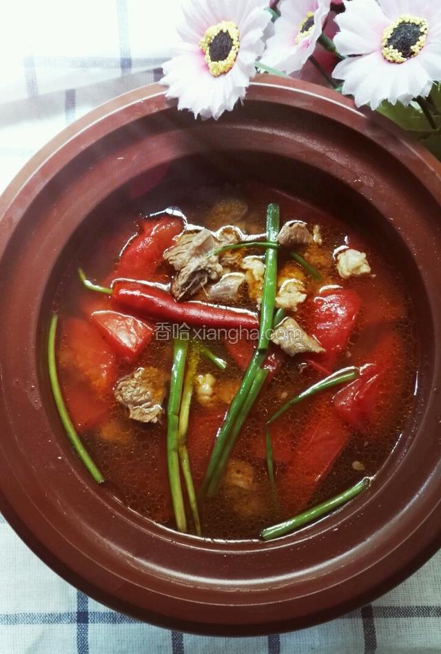 5.加入番茄块,再炖煮至番茄出汁。加入盐和黑胡椒调味,放入小葱段。鲜香汁浓的番茄牛腩煲出锅了。