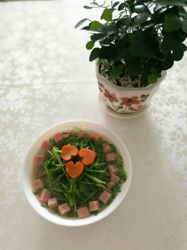 6.最后在面上加入一点点红萝卜做点缀,一份色彩碧绿的上汤豆苗就好啦