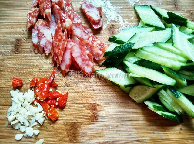 2.黄瓜切菱形,腊肠切片,蒜和干椒切粒