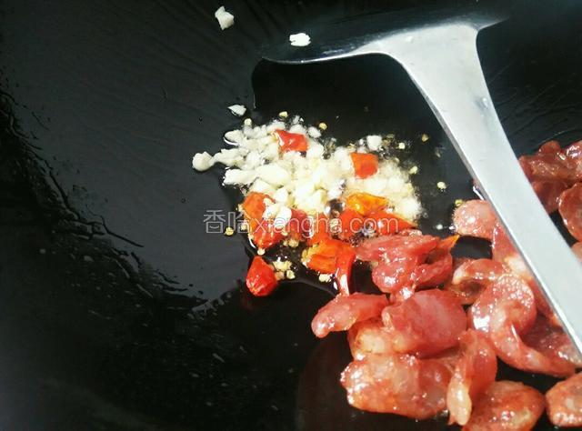 4.煸岀油后,把腊肠推到边上,放入蒜和红椒爆香
