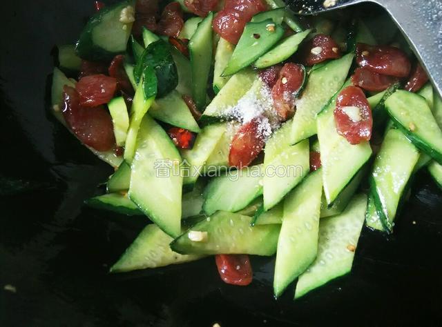 6.炒至黄瓜发软,调入盐和鸡精翻炒均匀,岀锅