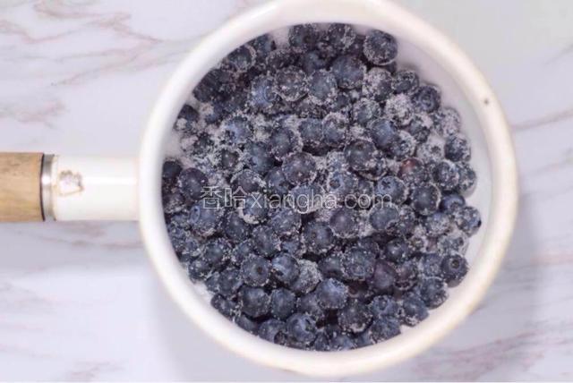 1.新鲜蓝莓175克加40克细砂糖放入小锅中,使每颗蓝莓均匀裹上砂糖。