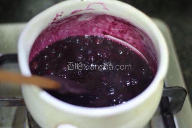 2.开小火,用刮刀不断搅拌,砂糖完全溶解,蓝莓渗出汁水。等到蓝莓酱汁开始冒泡沸腾,改用中火,继续用刮刀翻拌,直到蓝莓酱变得浓稠呈酱状。