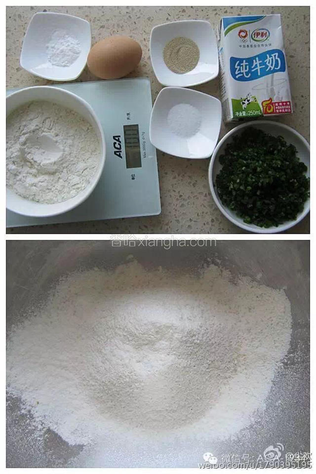 2.在面粉中倒入切碎的香葱.加入油、牛奶、蛋液。