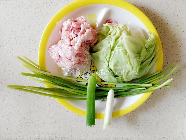 3.准备饺子馅食材:卷心菜1/3个,蒜苔10根左右.猪肉馅150G,大葱1根