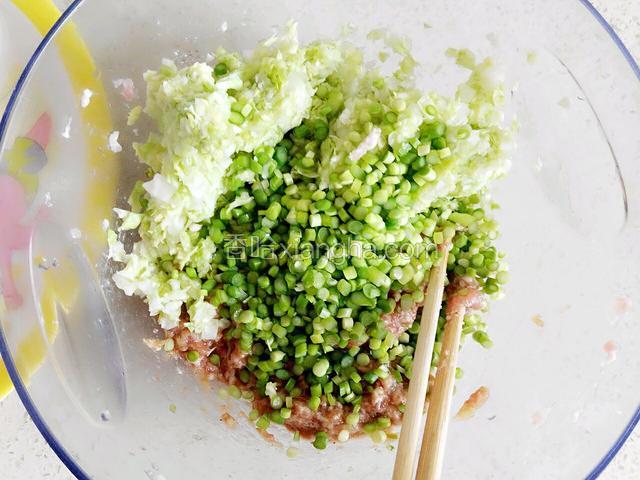 5.打水馅,肉馅中加25ml水,顺时针搅拌,让水融入肉馅成粘糊状