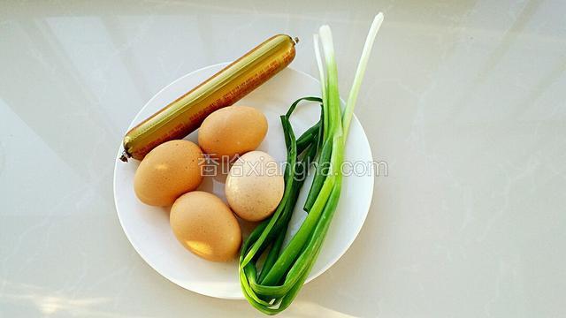 2.把鸡蛋打散,火腿肠切片,葱切段(也可以切葱花。)。