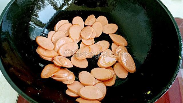 5.另起锅放适量油,倒入火腿肠小火煸炒变色。