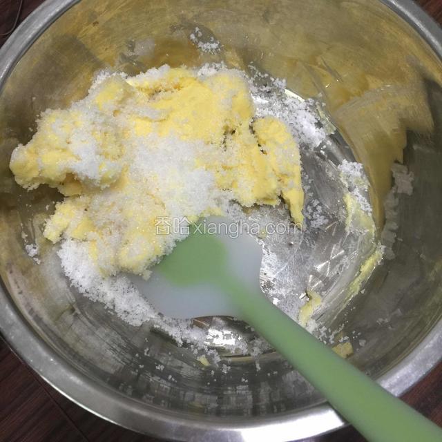 2.准备一个无油无水的盆,把黄油和细糖倒入,搅拌刀先轻轻搅拌一下,以免打蛋器打的时候糖溅出来。
