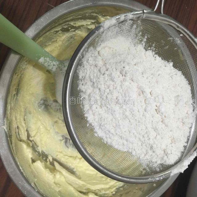 5.把面粉分三次过筛至盆里,用搅拌刀搅拌。