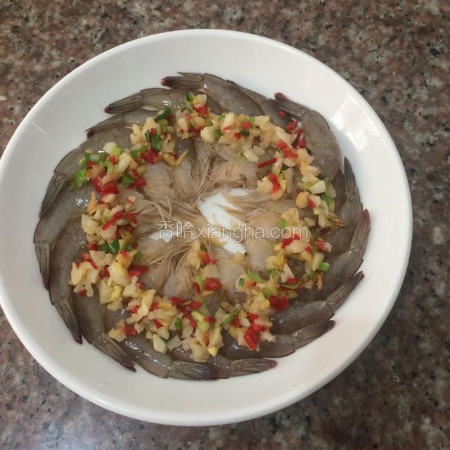 6.把爆好的蒜姜,青红椒粒均匀的撒在虾上。