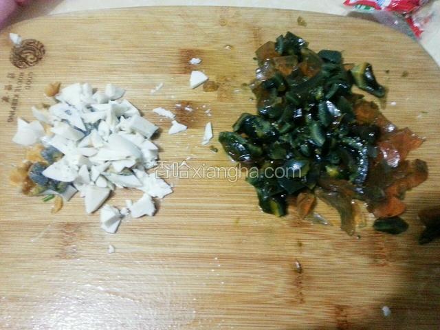 6.将咸鸭蛋和皮蛋放入碗中,然后倒入蛋白