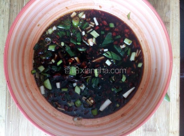 3.把酱油,米醋,香油,剁辣椒,白糖,花椒面,味精,葱末,蒜片,捞拌汁,放入碗内,调匀成汁。