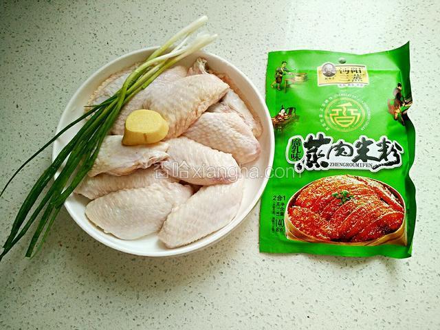 1.鸡翅、姜、葱洗净,腐乳蒸肉米粉。