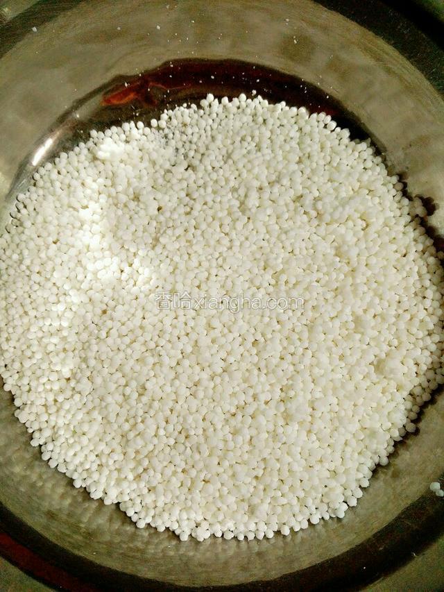 1.用些许水把西米打湿润,晃动容器,让西米均匀受水。