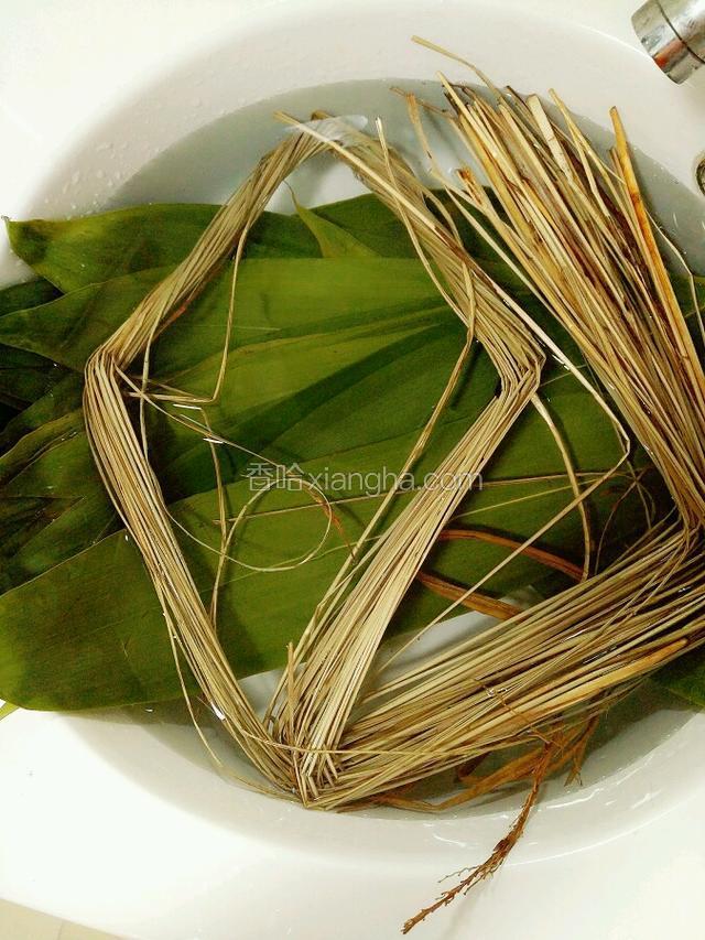 3.把粽叶和草绳洗干净,粽叶沥干备用,草绳用水泡10分钟左右。