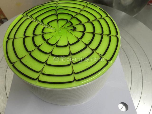 6.将绿色的果酱轻轻的抹在蛋糕上面一层即可!要抹平.用巧克力线膏从中心点向外转圈!间距均匀一点