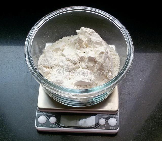 1.面粉150克和玉米淀粉150克称重。