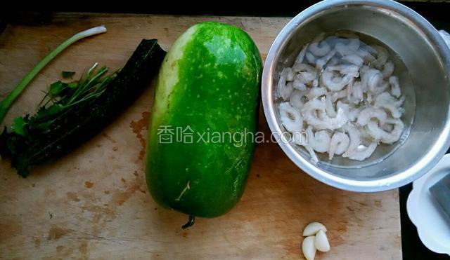 2.冬瓜去皮,切片或块。黄瓜切丝,葱花,蒜片,香菜末姜末等。
