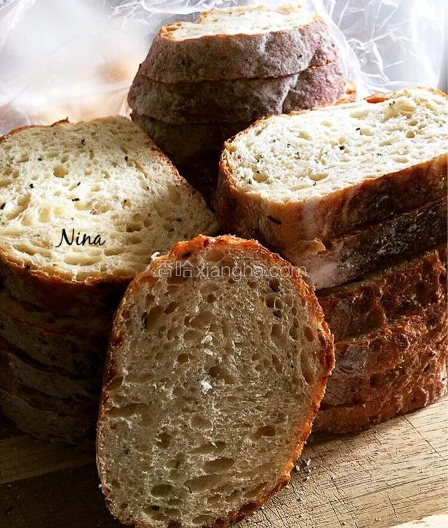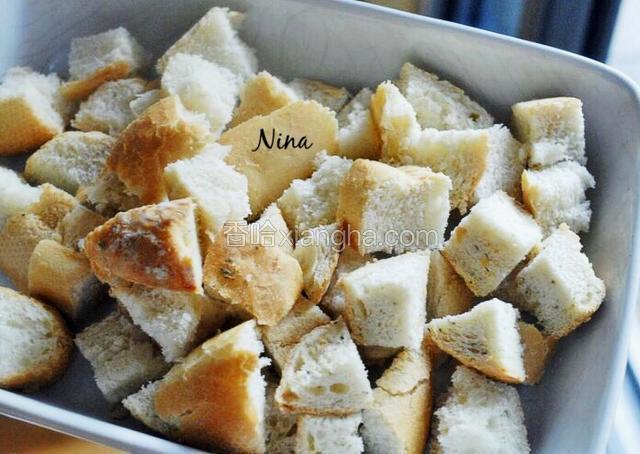 1.选用放置了1-2天的法棍,水份少一点。 烤箱预热190度。
