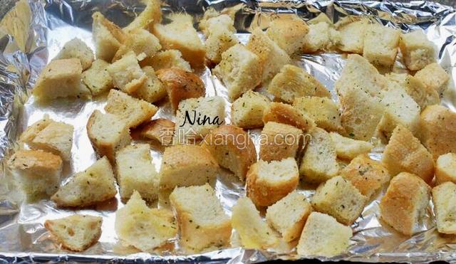 2.切成小粒,加入所有配料在碗中搅拌均匀,橄榄油不要吝啬,否则烤出来的不脆。