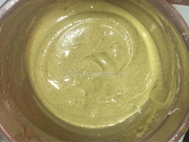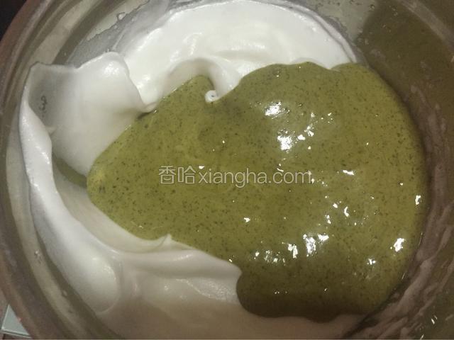 5.把低筋面粉和抹茶粉混合过筛加入,分两次筛入,每次拌匀再筛入下一次