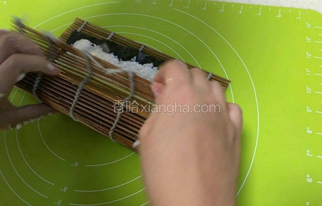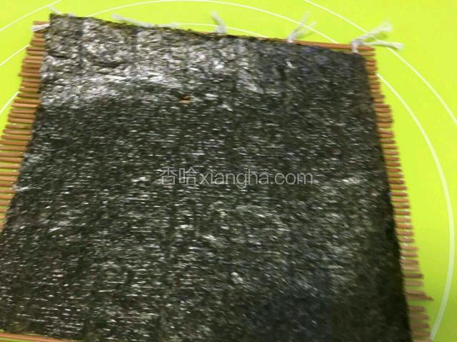 3.将海苔平平的辅在竹上。