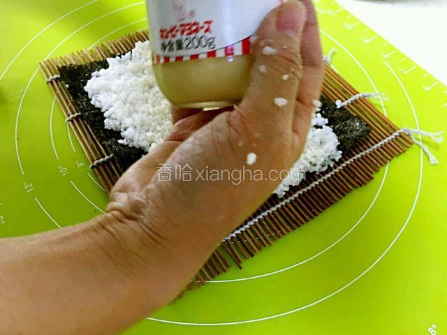 6.在压紧的米饭上,抹点咸口味的沙拉酱。