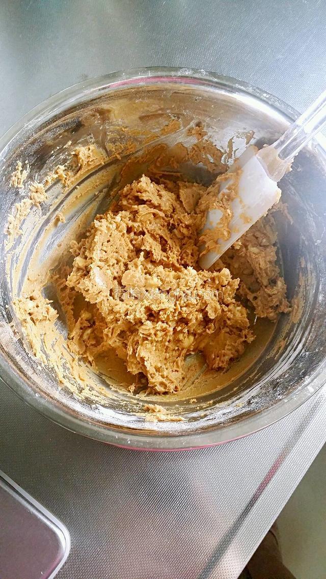 6.低筋面粉和小苏打混合后,筛入打发好的黄油里,用橡皮刮刀拌匀成为均匀的饼干面糊。