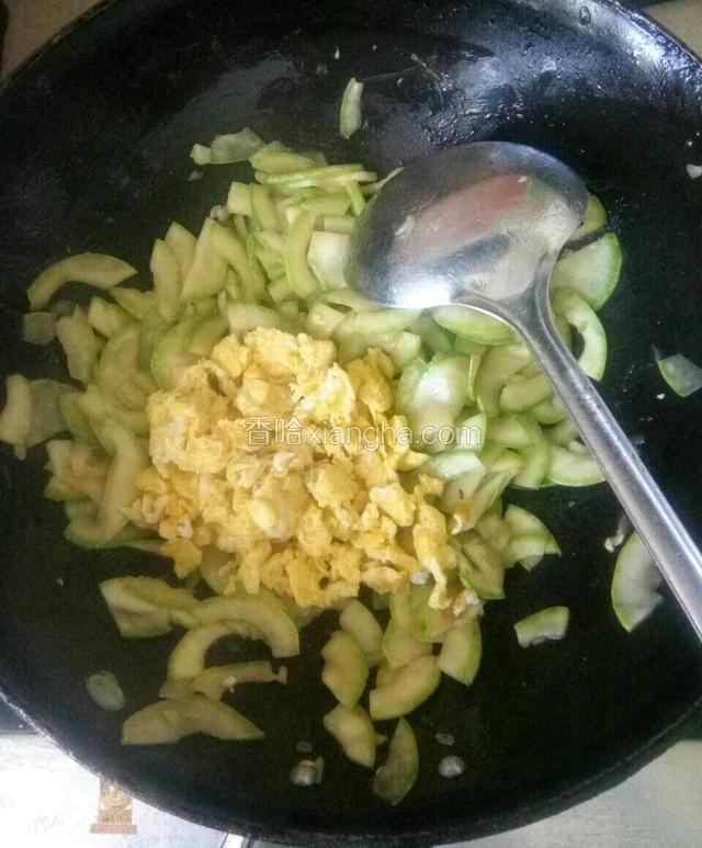 5.锅中油热后,将鸡蛋打散倒入锅中炒成块状,盛出备用。