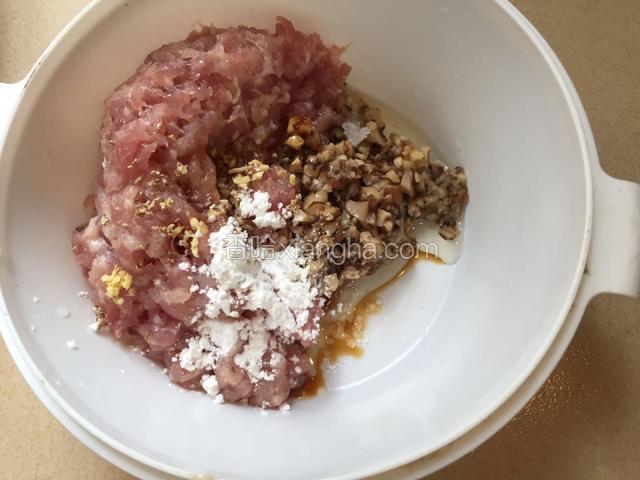 3.香菇 和猪肉切碎加入花生油 盐 生抽 生粉 姜末白糖 胡椒粉拌均备用