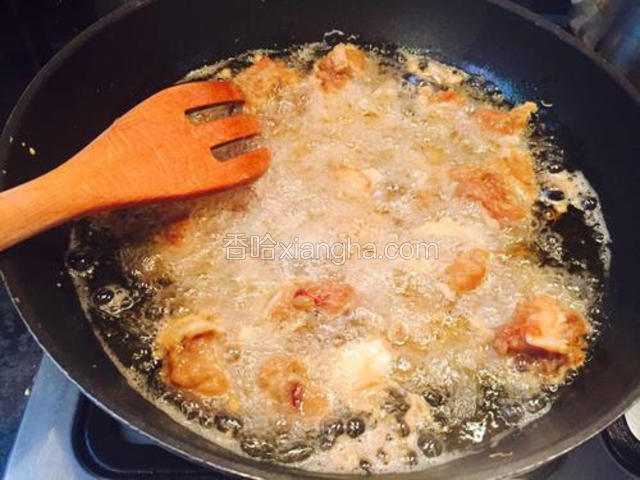 5.热油冒烟第一次一粒粒下排骨炸至金黄间中用木叉扒开粘着的排骨