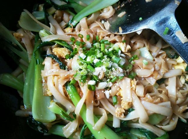6.青菜炒软后放入河粉,鸡蛋,再放入盐,五香粉,生抽,炒匀