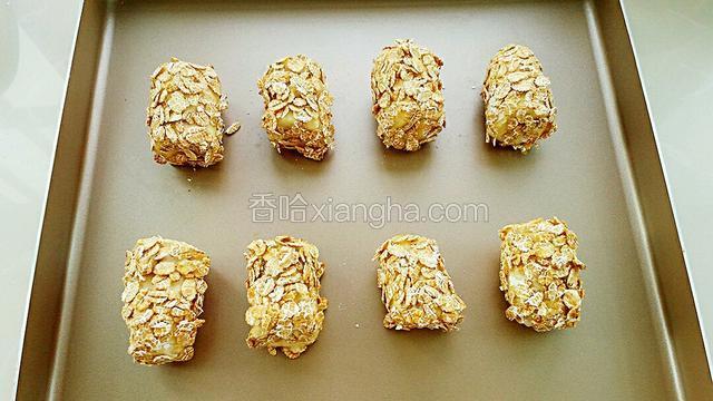 6.烤箱180度预热,把所有做好的香蕉段排放不沾烤盘内。