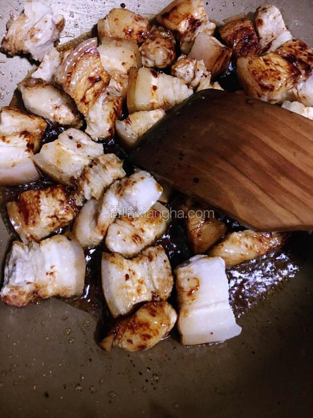 6.放入五花肉不停翻炒片刻均匀裹上糖色