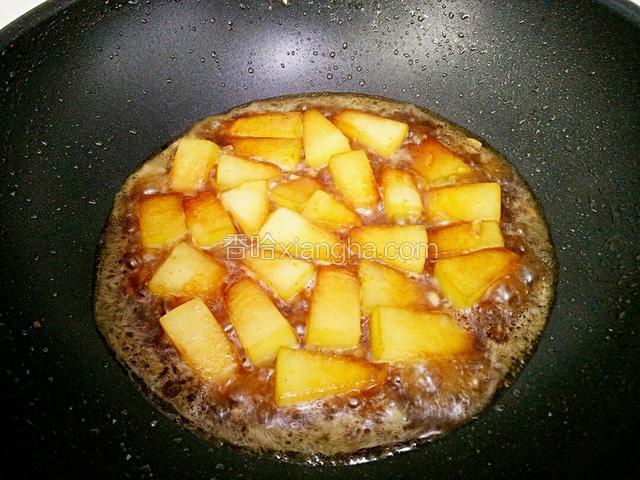 4.锅里放入适量油,(小火)加入冰糖熬化。