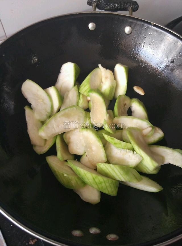 4.炒至丝瓜变软,下盐,红椒,加一点点水焖一会,起锅前加少许味精。