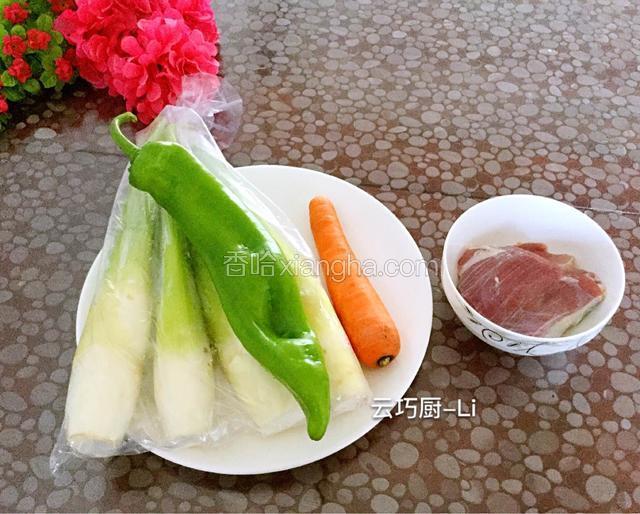 1.准备好食材。茭白400克、胡萝卜20克、辣椒20克、猪肉150克