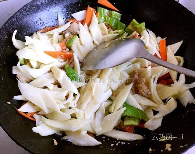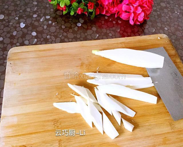 5.锅里加水烧开、茭白下水焯一下!再用水拔凉、控干水分备用。