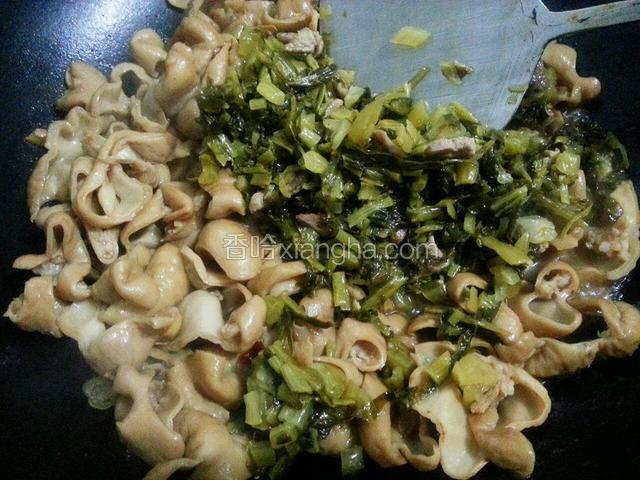 1.准备好猪大肠和雪菜,猪大肠买了洗干净的,雪菜事先炒好啦