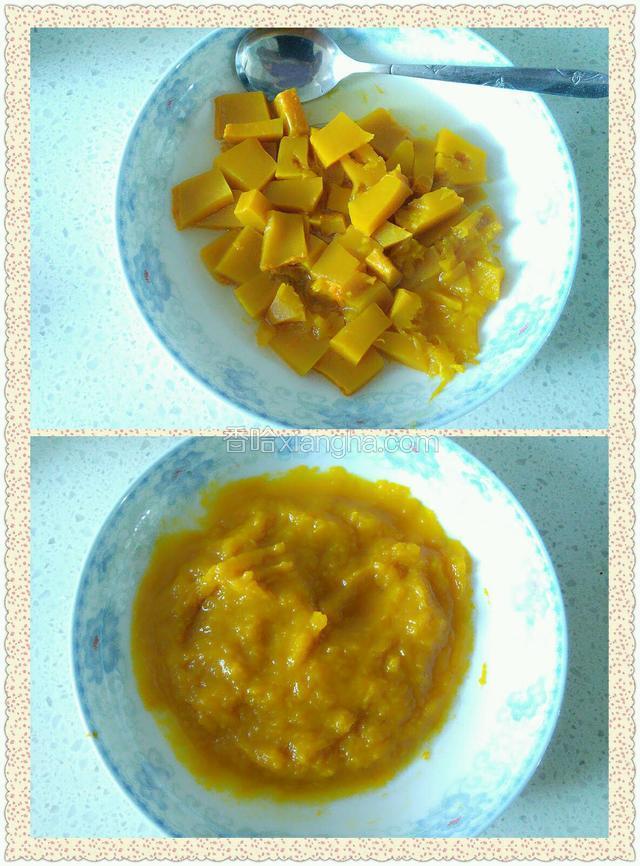 2.南瓜去皮,切成小块装入盘中,隔水蒸熟