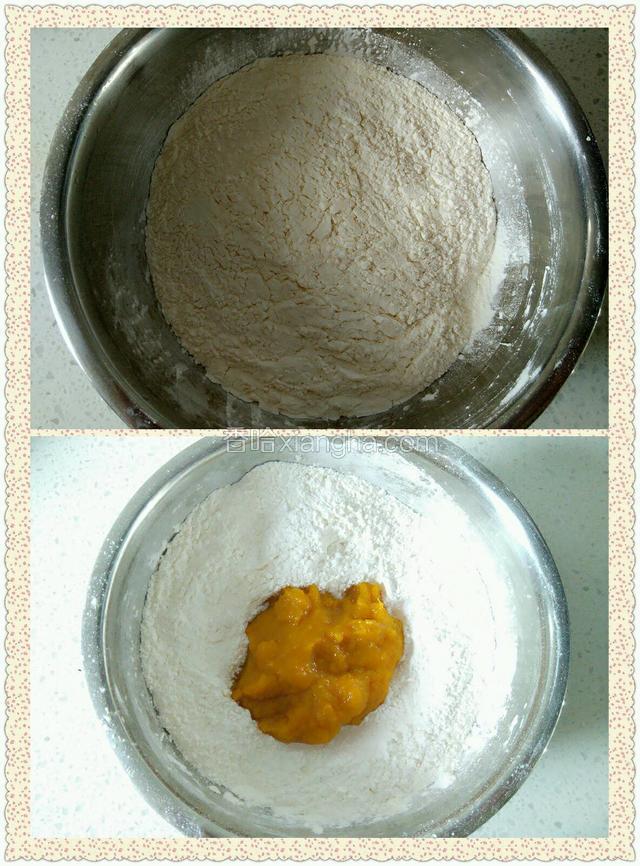 4.将面粉,糯米粉过筛,混匀,加入白糖,加入凉透的南瓜糊,揉成面团